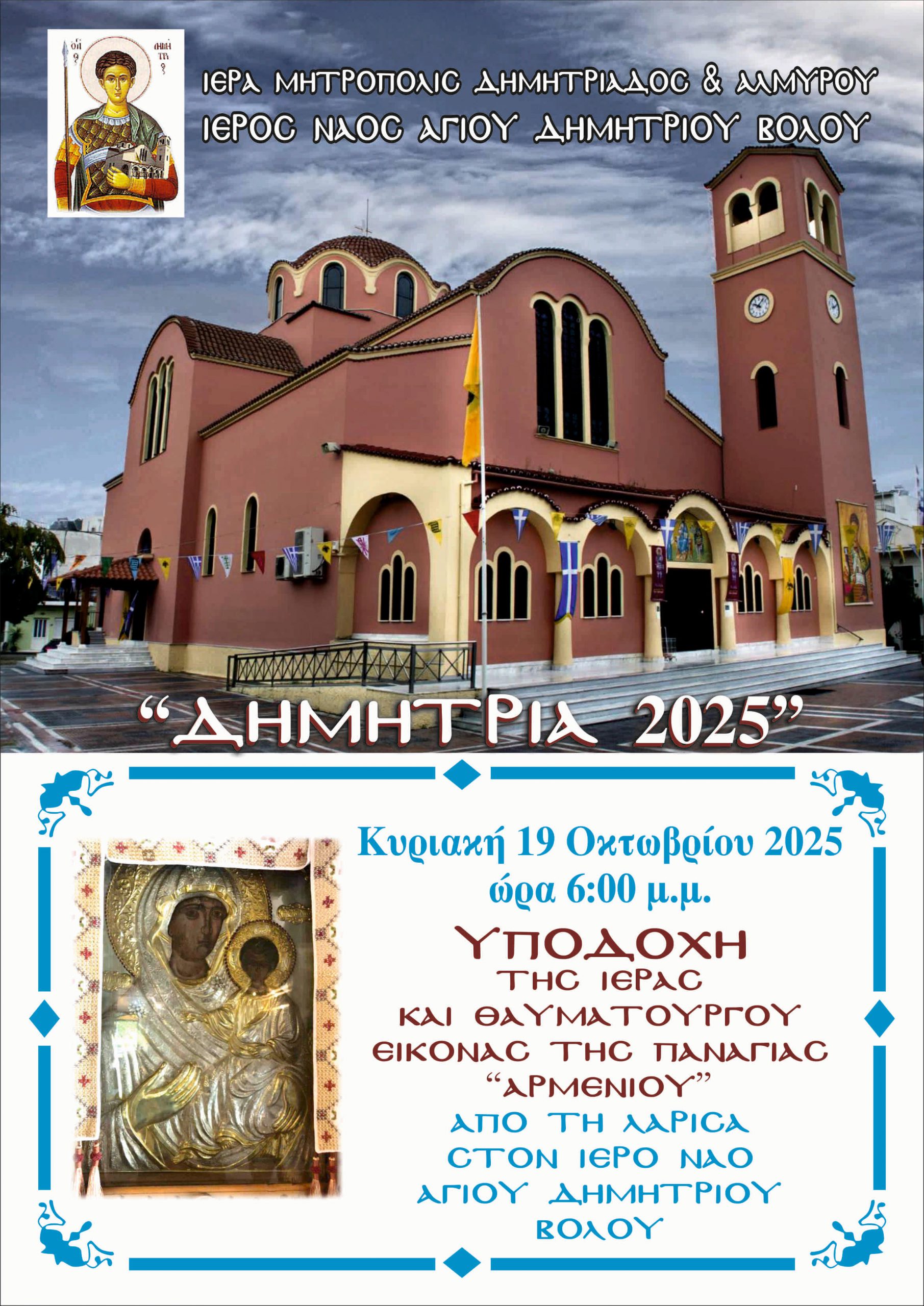 Με την υποδοχή της Ιεράς και Θαυματουργού Εικόνος της Παναγίας “Αρμενίου”, η οποία φυλάσσεται στο Ιερό Παρεκκλήσιο της Παναγίας της Αρμενιώτισσας, στο Αρμένιο Λαρίσης, ανοίγει την Κυριακή 19 Οκτωβρίου η αυλαία των «Δημητρίων 2025», της εβδομάδος λατρευτικών εκδηλώσεως της ομώνυμης ενορίας της Νέας Δημητριάδας, επί τη εορτή του Αγίου Μεγαλομάρτυρος Δημητρίου του Μυροβλύτου.