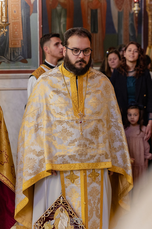 Στο τέλος της Θείας Λειτουργίας, ο Σεβασμιώτατος προέβη στη χειροθεσία εις Πρωτοπρεσβύτερο του Προϊσταμένου του Ιερού Ναού, π. Σταύρου Σωτηρόπουλου, εκφράζοντας τη χαρά του για τη λειτουργική σύναξη και αναφέροντας: «Η Θεία Λειτουργία είναι γεγονός χαράς, και για τον Επίσκοπο είναι μεγάλη χαρά όταν λειτουργεί με αγαπητούς ιερείς και με λαό που αγαπά. Θέλω σήμερα να ολοκληρώσω αυτή τη χαρά δίνοντας το οφφίκιο του Πρωτοπρεσβυτέρου στον πατέρα Σταύρο, έναν ιερέα που είχα τιμήσει μετά τις πλημμύρες για τη μεγάλη θυσιαστική του προσφορά και στάση ζωής, ο οποίος συνεχίζει το έργο του με αφοσίωση, υπακοή και ταπείνωση». Αναφερόμενος στη διαδρομή των αδελφών Σταύρου και Ιωάννη, ο Σεβασμιώτατος επεσήμανε τη συνοχή και συνέχεια της εκκλησιαστικής ζωής, κάνοντας ιδιαίτερη μνεία στον π. Χαρίλαο Παπαγεωργίου, «ο οποίος ως αναγνώστης το 1983 είχε παρευρεθεί στη δική μου χειροτονία και αργότερα, όταν ανέλαβα τη Μητρόπολη, έγινε στενός συνεργάτης μου», παραδίδοντας στην Εκκλησία πνευματικά του παιδιά, μεταξύ των οποίων και οι δύο αδελφοί. Αναφέρθηκε ακόμη στη διακονία τους στο Γραφείο Τύπου και στη διεύθυνση του Συνεδριακού Κέντρου Θεσσαλίας, καταλήγοντας ότι «αυτή είναι η χαρά του Επισκόπου… έτσι είναι ζωντανή μια τοπική Εκκλησία· μαζί συγκροτούμε το σώμα του Χριστού». Κλείνοντας, υπενθύμισε προς τον π. Σταύρο ότι «ο Σταυρός δεν είναι κόσμημα, αλλά επιστήθιος Σταυρός για να θυμίζει ότι πορευόμεθα με τη Σταύρωση του Χριστού για να δείξουμε τον δρόμο της Ανάστασης», ευχόμενος να φανεί «αντάξιος των προσδοκιών» και να συνεχίσει την ιερατική του πορεία «με το ίδιο πνεύμα και τρόπο», ώστε όλοι μαζί να δίδουν «καλή απολογία στον ουράνιο Θυσιαστήριο».