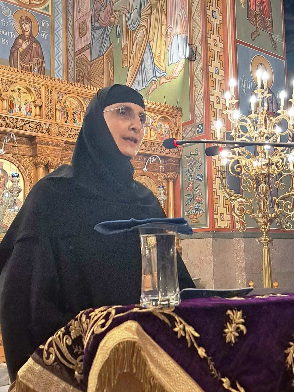 Η Σύναξη ξεκίνησε με ύμνους εκ της Ακολουθίας της Οσίας Γαβριηλίας, που απέδωσε η χορωδία του Ναού, υπό την δ/νση του Πρωτοψάλτου κ. Ευσταθίου Γραμμένου. Ακολούθως, ο Προϊστάμενος του Ναού Αρχιμ. Επιφάνιος Οικονόμου τόνισε ότι «η Οσία Γαβριηλία δεν ήταν μια συμβατική Μοναχή, ενταγμένη σε μια μοναστική αδελφότητα, όπου θα μπορούσε να βιώσει την ησυχαστική εμπειρία της ασκήσεως και της προσευχής, απαλλαγμένη από εξωτερικές μέριμνες και κοσμικούς περισπασμούς. Αντιθέτως, βίωσε έντονα την πνευματική εξωστρέφεια και την περιπλάνηση και έθεσε τον εαυτό της στην διακονία των ταπεινών και καταφρονεμένων, κάνοντας μοναστήρι της όλη την οικουμένη».