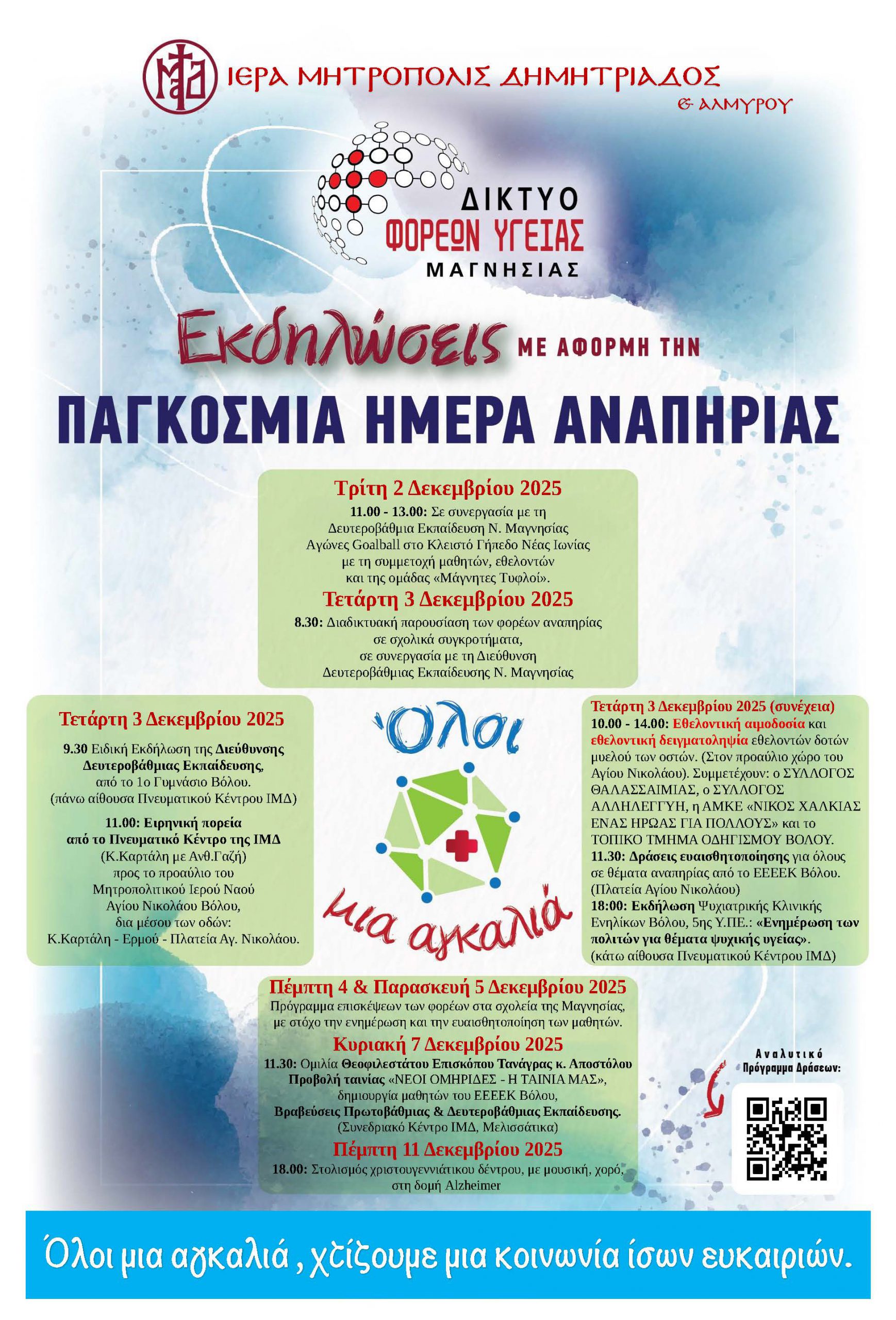 Από την Τρίτη 2 Δεκεμβρίου έως και την Πέμπτη 11 Δεκεμβρίου θα πραγματοποιηθούν οι εκδηλώσεις αφιερωμένες στην αναπηρία, από το Δίκτυο Φορέων Υγείας Μαγνησίας που συντονίζεται από την Ιερά Μητρόπολη Δημητριάδος.