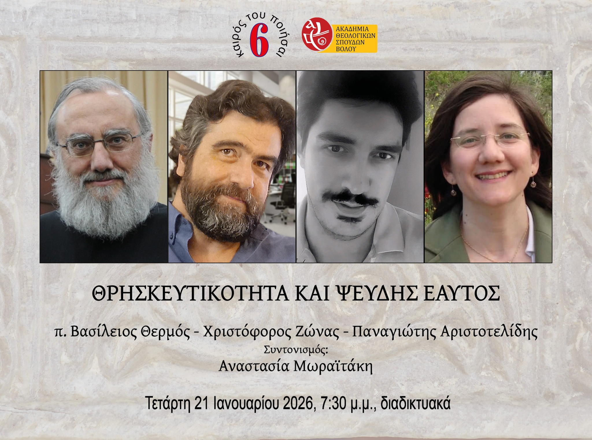 Η πρώτη εκδήλωση του φετινού κύκλου «Καιρός του ποιήσαι» θα πραγματοποιηθεί την Τετάρτη 21 Ιανουαρίου 2026 στις 7.30 μ.μ. με θέμα «Θρησκευτικότητα και ψευδής εαυτός». Θα συμμετάσχουν ως ομιλητές ο π. Βασίλειος Θερμός (πρώην Καθηγητής Ανωτάτης Εκκλησιαστικής Ακαδημίας Αθηνών, Ψυχίατρος παιδιών και εφήβων), ο Χριστόφορος Ζώνας (Ψυχολόγος, Ψυχοθεραπευτής), και ο Παναγιώτης Αριστοτελίδης (Ψυχίατρος, εκπαιδευόμενο Μέλος της Ελληνικής Εταιρείας Ψυχανάλυσης). Τη συζήτηση θα συντονίσει η Αναστασία Μωραϊτάκη (Ψυχολόγος, Υπαρξιακή Συστημική ψυχοθεραπεύτρια).