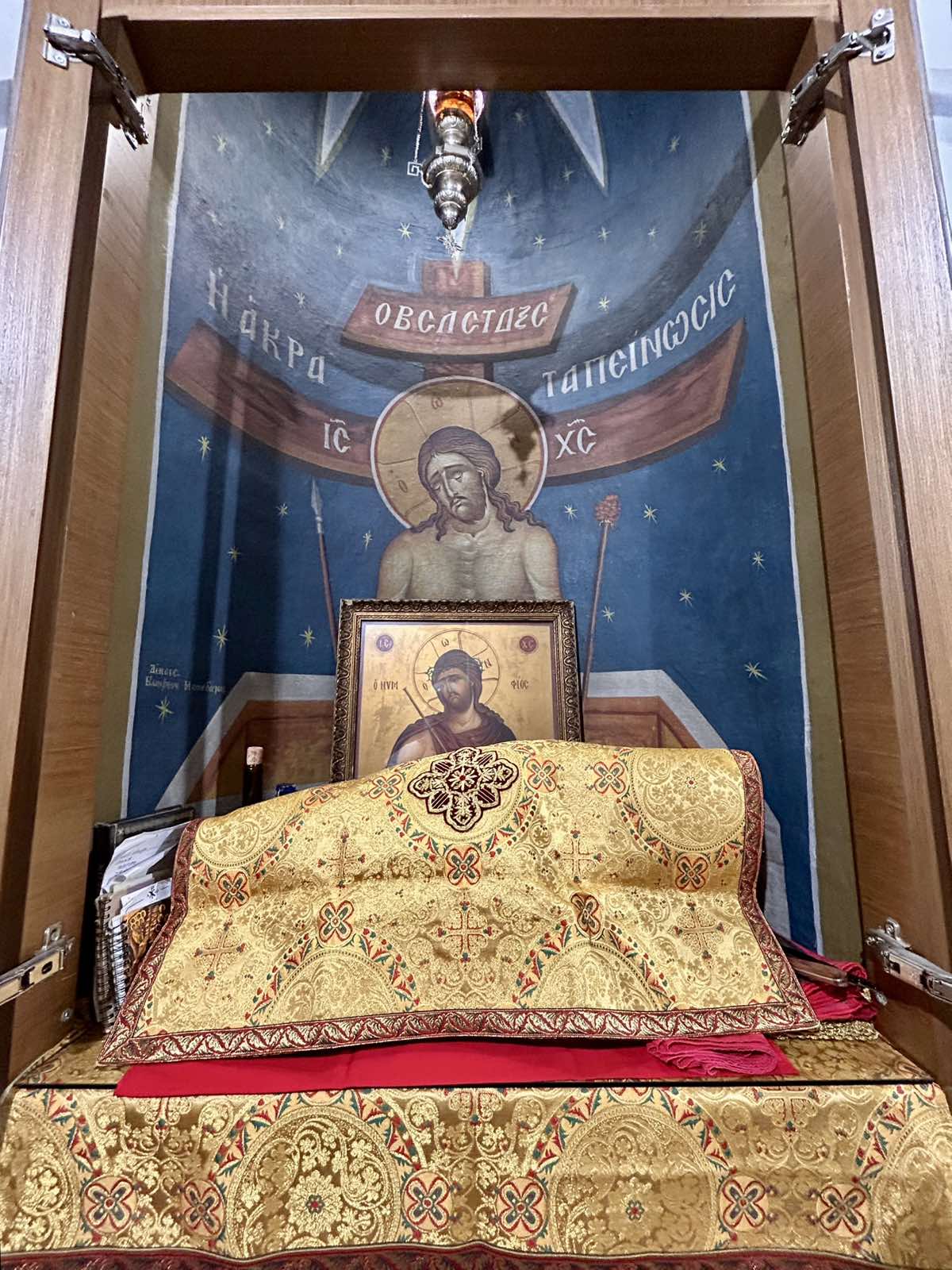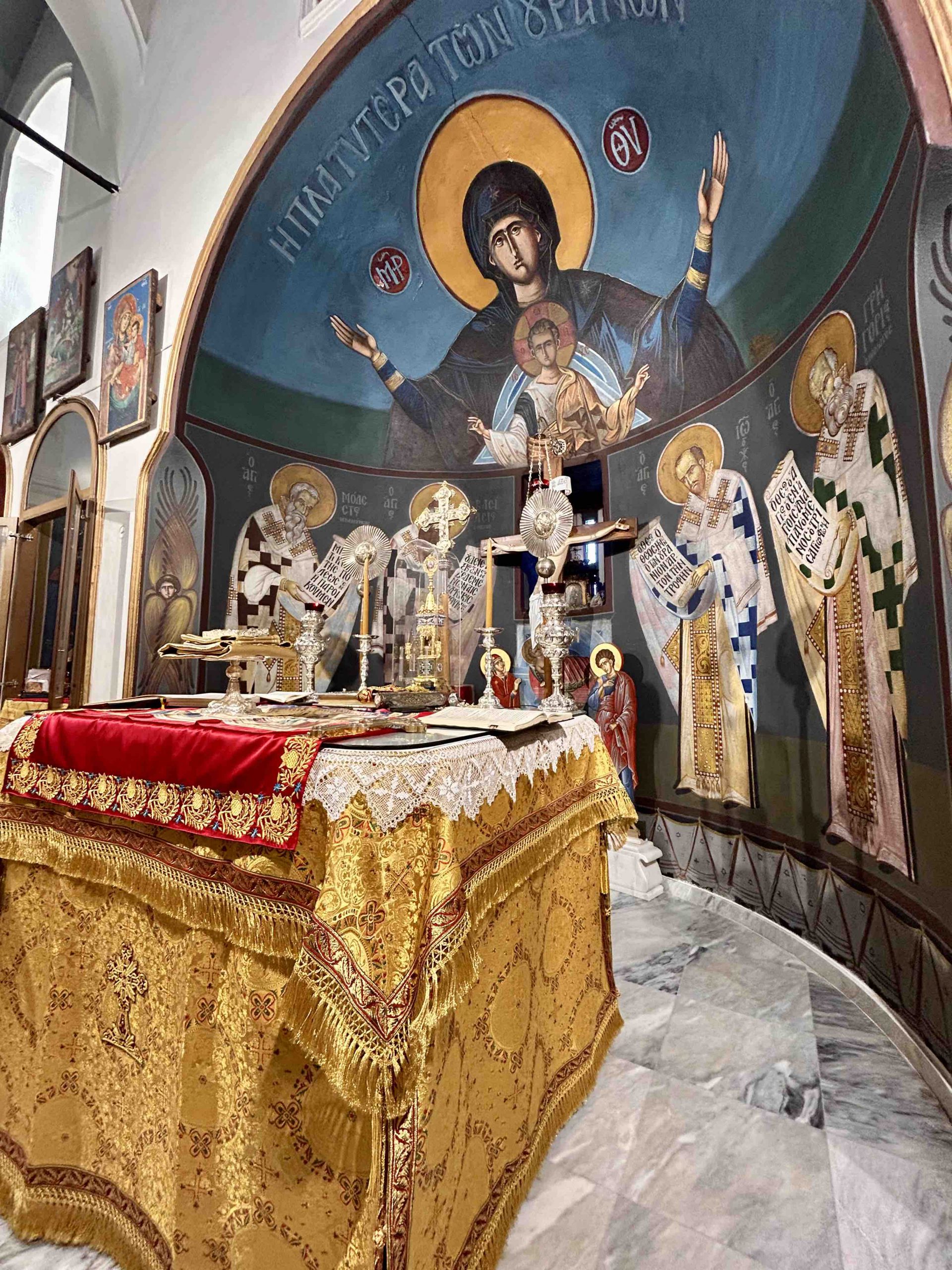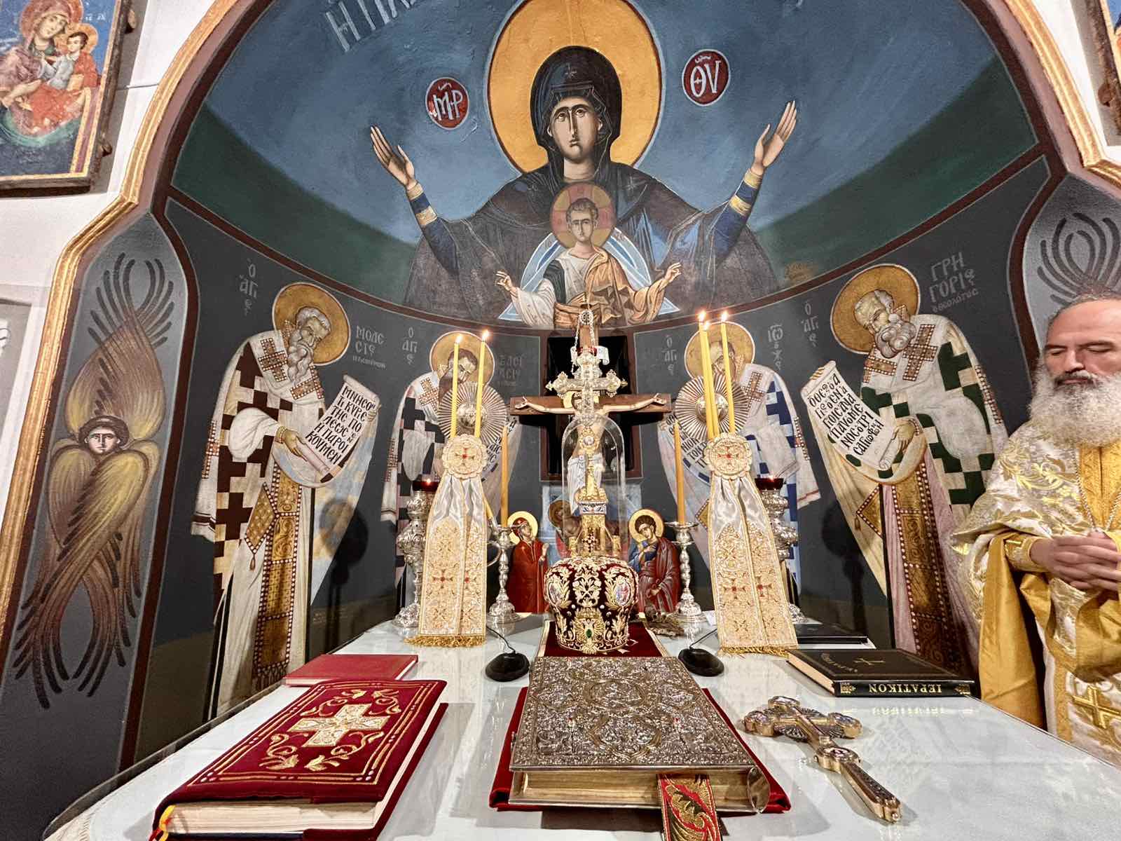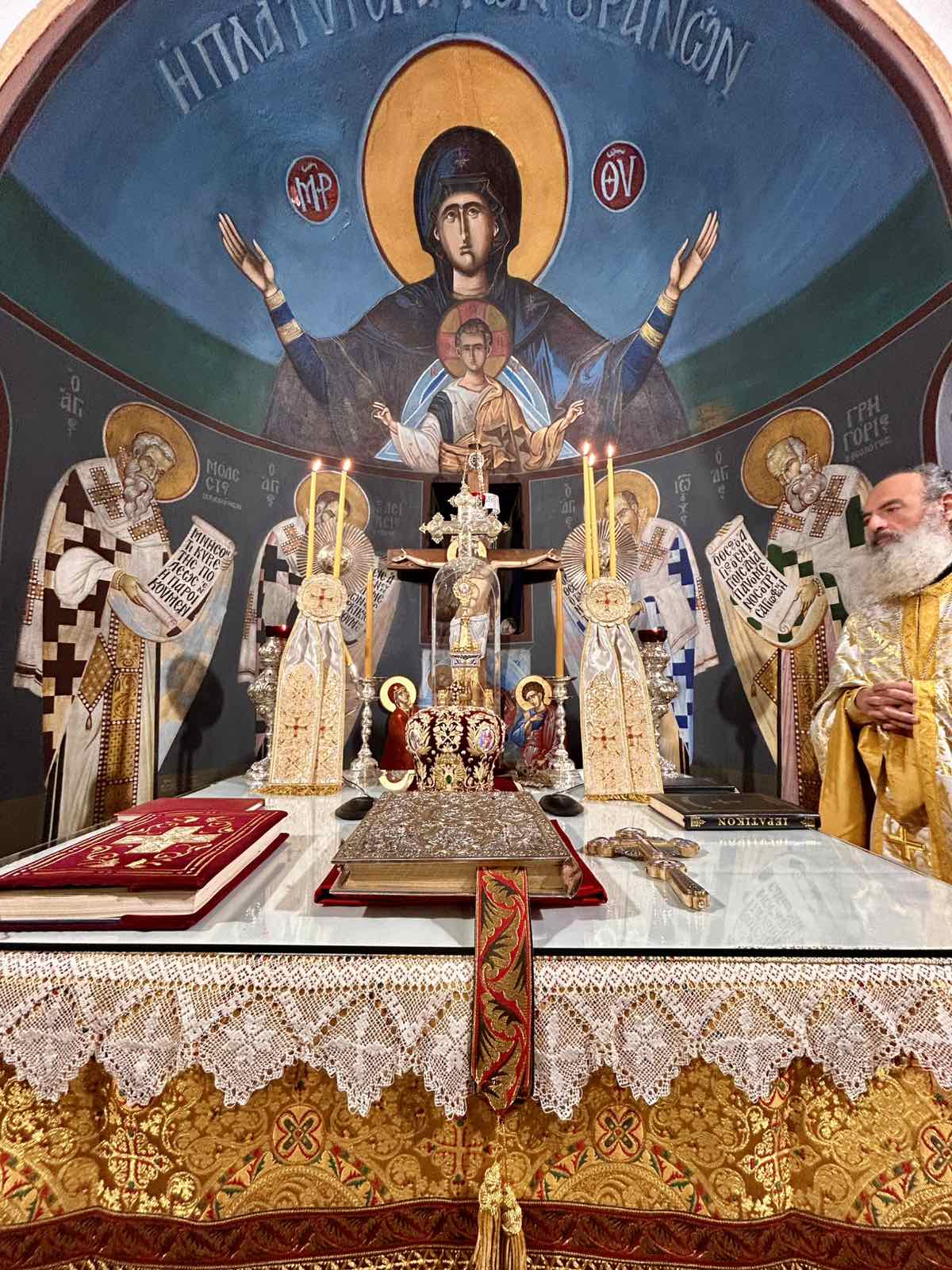 Στο τέλος της Θείας Λειτουργίας, ο Σεβασμιώτατος καλωσόρισε τους προσκυνητές από την Κάρπαθο και έκανε μνεία ειδική στον Ηγούμενο της Μονής της Καρπάθου Αρχιμ. Καλλίνικο Μαυρολέοντα, που προσφέρει τα μέγιστα και στην εκπαίδευση των παιδιών, ως Δάσκαλος, με τον οποίον συνδέονται παλαιόθεν. Ο επικεφαλής δε των προσκυνητών, π. Μιχαήλ, προσέφερε στον Σεβασμιώτατο αντίγραφο της Ιεράς και Θαυματουργού Εικόνος της Παναγίας του Βράχου από την Κάρπαθο.