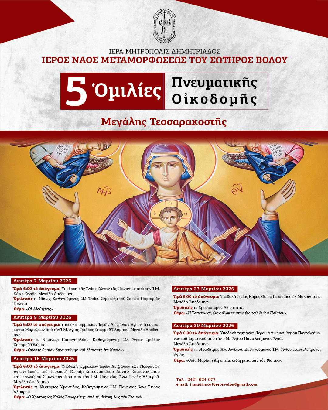 Στο πλαίσιο της ποιμαντικής μέριμνας της Τοπικής μας Εκκλησίας, κατά την κατανυκτική περίοδο της Μεγάλης Τεσσαρακοστής, η ενορία της Μεταμορφώσεως του Σωτήρος Βόλου τελεί, κάθε Δευτέρα αυτής της περιόδου, την Ακολουθία του Μεγάλου Αποδείπνου, στο τέλος της οποίας εκλεκτοί προσκεκλημένοι ομιλητές αναπτύσσουν θέματα πνευματικής οικοδομής και τροφοδοσίας.