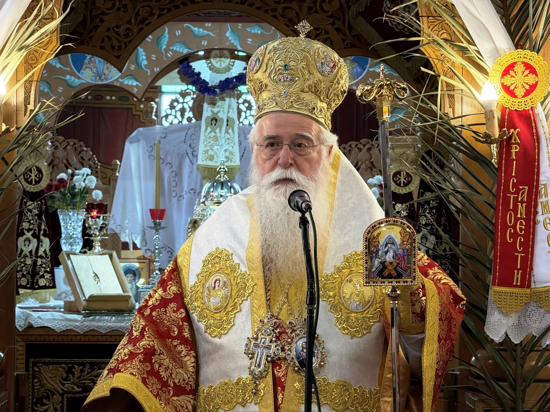 Στην ομιλία του ο Σεβασμιώτατος ανέφερε ότι: «Όλοι οι Άγιοι, άνδρες και γυναίκες, είναι μάρτυρες της Αναστάσεως του Χριστού και μάρτυρες της Αναστάσεως είμαστε και όλοι οι πιστοί, όσοι βαπτιστήκαμε στο όνομα της Αγίας Τριάδος και πιστεύουμε στον Αναστάντα Κύριό μας. Όμως ο Άγιος Γεώργιος, τον οποίο σήμερα τιμούμε, είναι κατεξοχήν Αναστάσιμος Άγιος, διότι η εορτή του είναι πάντοτε συνδεδεμένη με το “Χριστός Ανέστη” και το φως της Αναστάσεως. Ο Άγιος αυτός δεν πίστεψε απλώς σε έναν διδάσκαλο, αλλά στον Χριστό που σταυρώθηκε, πέθανε και αναστήθηκε και γι’ αυτό έγινε γενναίος μάρτυρας της πίστεως, νικώντας κάθε φόβο και κάθε κακό. Μας διδάσκει ακόμη ότι η ψυχή του ανθρώπου είναι σαν γη που χρειάζεται καλλιέργεια· όπως ο γεωργός φροντίζει τη γη του, έτσι και εμείς καλούμαστε να φροντίζουμε την ψυχή μας. Με τον Σταυρό του Χριστού αγωνιζόμαστε να διώξουμε ό,τι κακό υπάρχει μέσα μας και να καλλιεργήσουμε την πίστη, την αγάπη και την αλήθεια, ώστε η ζωή μας να γεμίζει με το φως της Αναστάσεως».