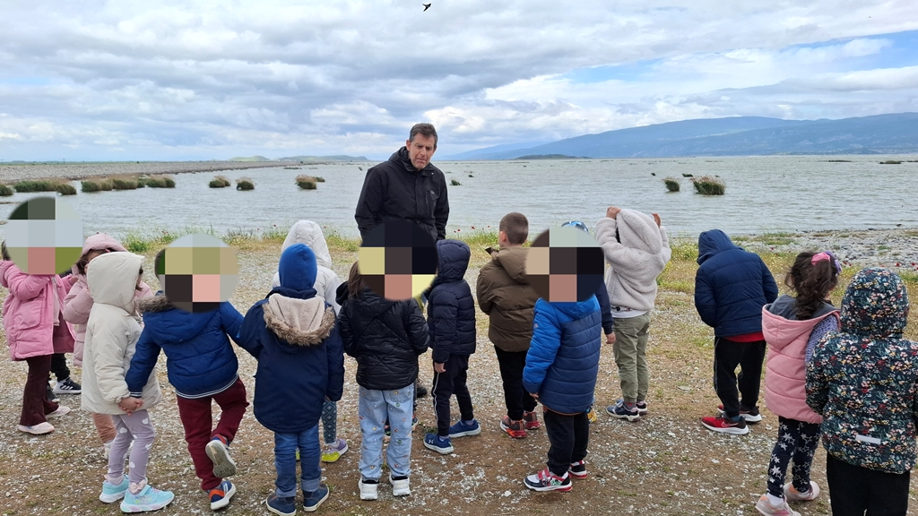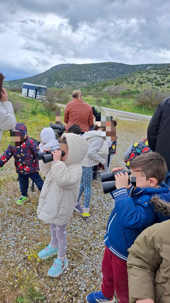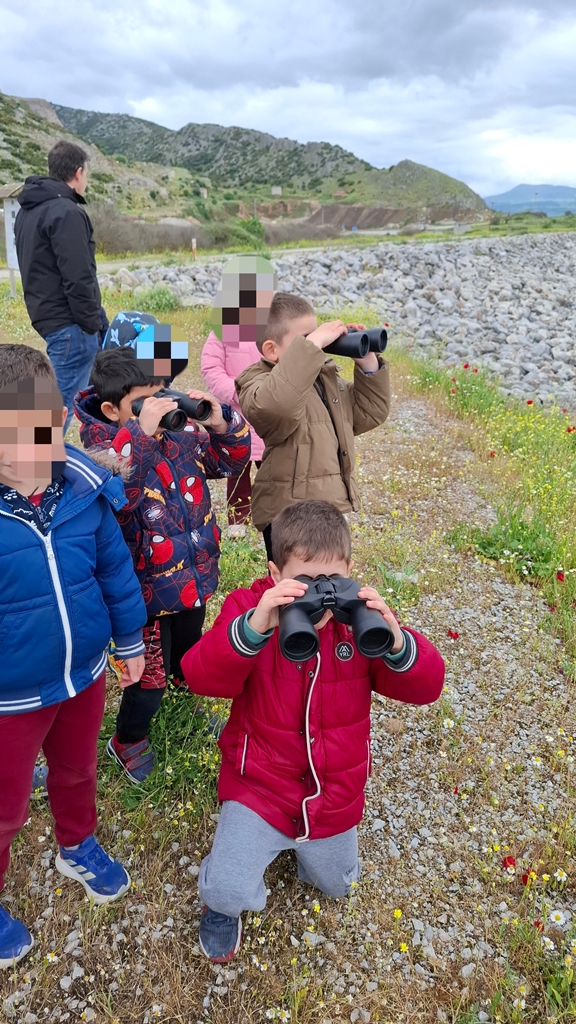 Στη συνέχεια, η δράση συνεχίστηκε στο σημείο ορνιθοπαρατήρησης της λίμνης. Με τη χρήση κιαλιών και τηλεσκοπίων, τα παιδιά είχαν την ευκαιρία να παρατηρήσουν έναν πελεκάνο, καθώς και να εντοπίσουν είδη που είχαν ήδη γνωρίσει στο μουσείο, μετατρέποντας τη γνώση σε ζωντανή εμπειρία.