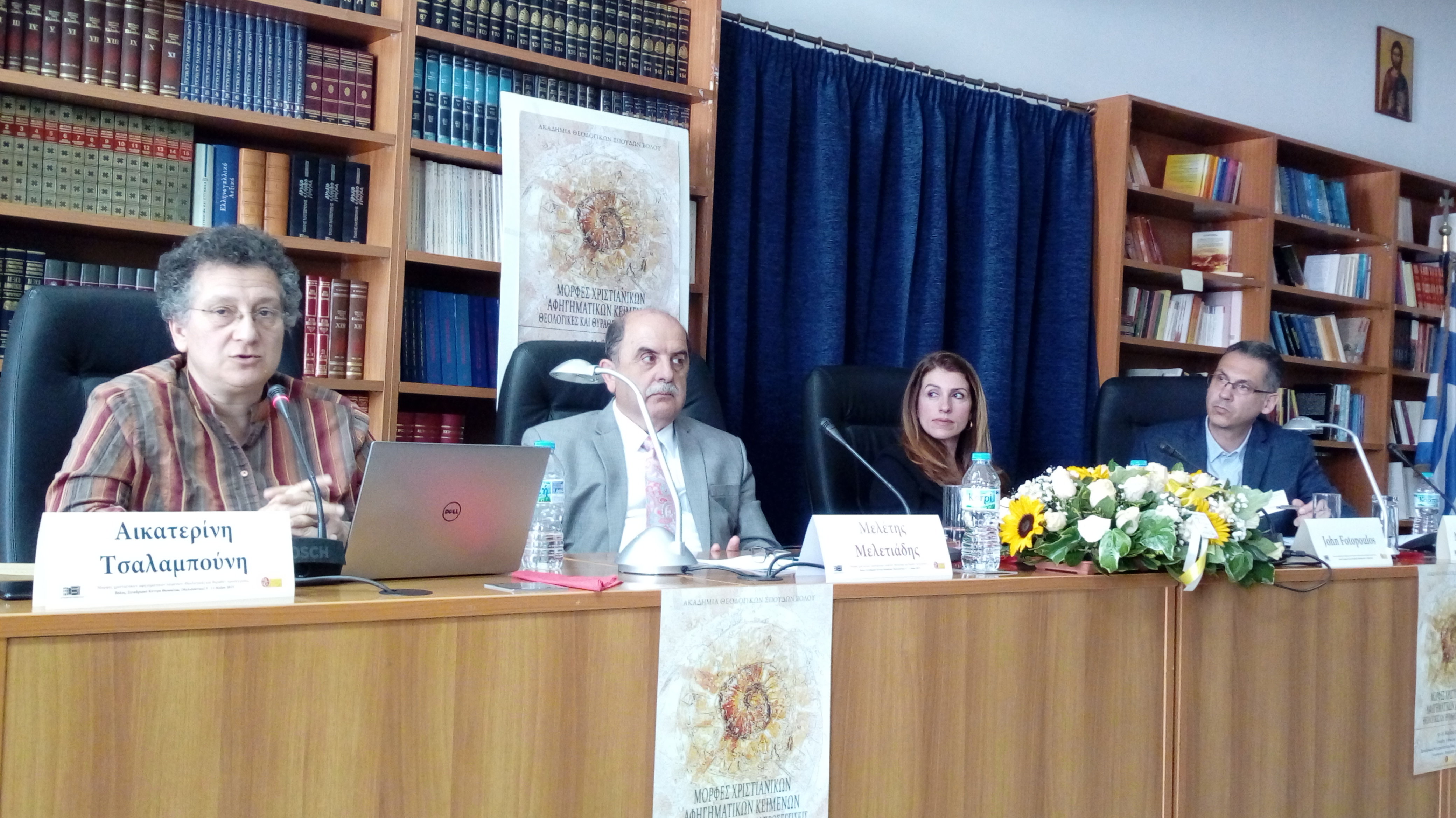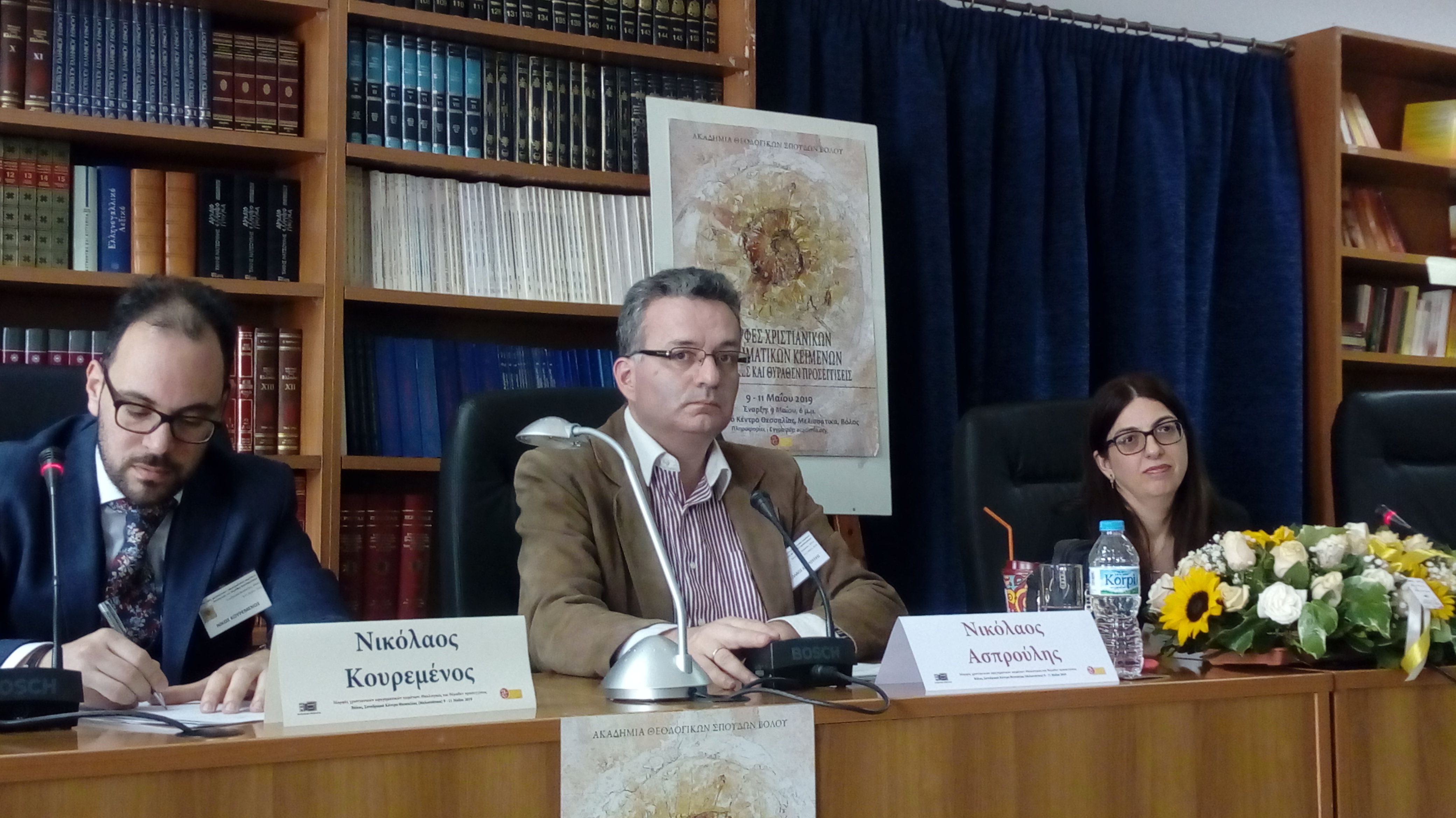 Στη δεύτερη πρωινή συνεδρία υπό την προεδρία του Γρηγόρη Στουρνάρα, Αρχαιολόγου, Δρ. Αρχιτεκτονικής Ε.Μ.Π, ο Δημήτριος Μόσχος, Αναπληρωτής Καθηγητής Θεολογικής Σχολής Ε.Κ.Π.Α., Μέλος του Δ.Σ. της Ακαδημίας Θεολογικών Σπουδών Βόλου μίλησε με θέμα «Η αποτύπωση διαφοροποιημένων θεολογικών αντιλήψεων περί ανθρώπου και ιστορίας σε αφηγηματικά κείμενα της ασκητικής γραμματείας». Σύμφωνα με τον ομιλητή, μέσα στο σύνολο των κειμένων και σε φαινομενικά απλοϊκές, «λαϊκές» διηγήσεις ενυπάρχουν διαφορετικές και σε διάφορους βαθμούς ανταγωνιστικές αντιλήψεις περί της φύσεως του ανθρώπου, του νοήματος της άσκησης ή της ιστορίας και του εσχατολογικού τέλους της που, επηρεάζουν ποικιλότροπα διαφορετικά κοινά και αντικατοπτρίζουν διαφορετικές αναζητήσεις ανά εποχή. Ο Φώτης Βασιλείου, Επίκουρος Καθηγητής Ιονίου Πανεπιστημίου, με τη σειρά του ανέπτυξε το θέμα «Γυναικείος ηρωισμός και αγιότητα στις βυζαντινές ψυχωφελείς ιστορίες», όπου εστίασε σε μία ψυχωφελή ιστορία από το ελληνικό dossier του Δανιήλ του Σκητιώτη, η οποία αναφέρεται σε ένα περιστατικό ακραίας ενδοοικογενειακής βίας και στην προσπάθεια του συγγραφέα να δημιουργήσει ένα νέο πρότυπο γυναικείας αγιότητας ενσωματώνοντας στο πορτραίτο της ηρωίδας του και «κοσμικές» αρετές.